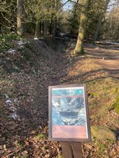 Van Dijken vertelt verder dat er een waterstroom in het bos loopt waarvoor de weg vrij wordt gemaakt. Een waterval noemt hij het, tot genoegen van de aanwezigen. Deze mensgemaakte waterval liet ooit het water door het bos stromen. Vanuit de landbouw werd destijds een zaksloot door het droogdal aangelegd, om te voorkomen dat het landbouwwater door het bos stroomde. Nu het water niet meer hoeft te wijken voor landbouw, wordt deze sloot gedempt.