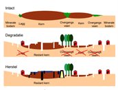 Schematische weergave van een intact, aangetast en hersteld hoogveenlandschap. Het bovenste plaatje stelt een theoretische hoogveenkoepel voor, de ‘restant kern’ in het onderstaande plaatje is een hoogveengebied na het nemen van herstelmaatregelen. Bron: Van Duinen et al. (2011).